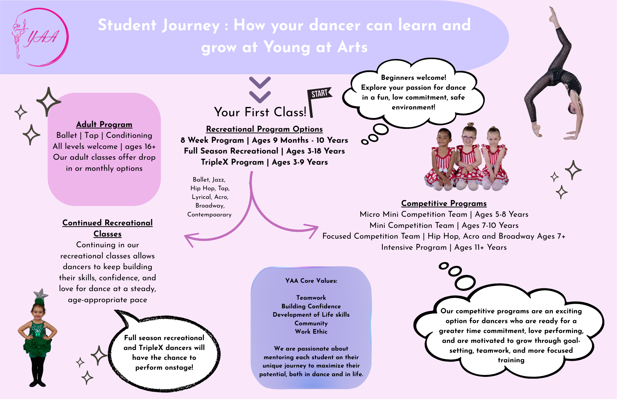 At the Young at Arts Dance Academy we have a number of dance programs to choose from! Whether you are just starting your dance journey, have many years of dance under your belt, or are simply looking for some more fitness and technique training in your life, we have you covered! Check out our programs below!